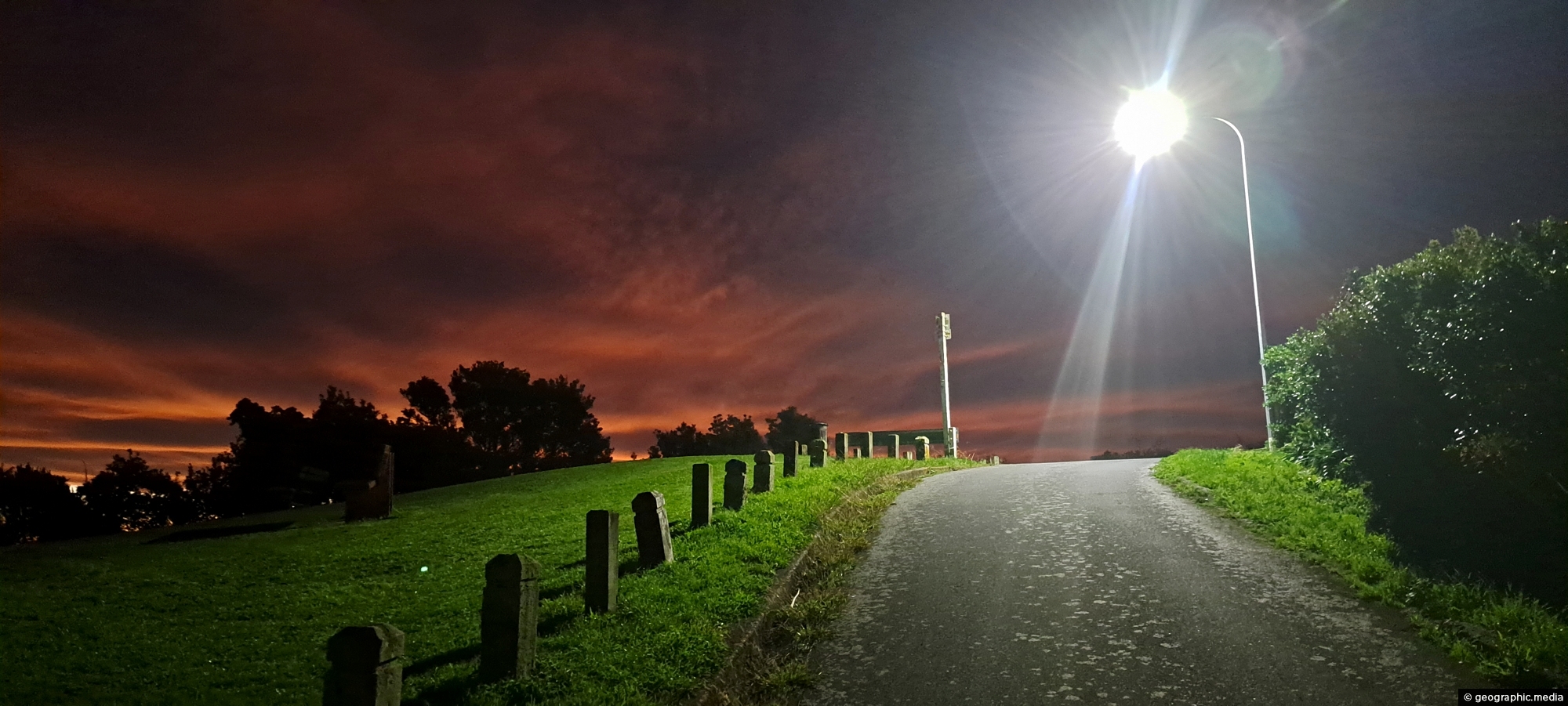 A winter sunset as seen from Vella Street, where the streetlight glows softly through the cold moisture hanging in the air.