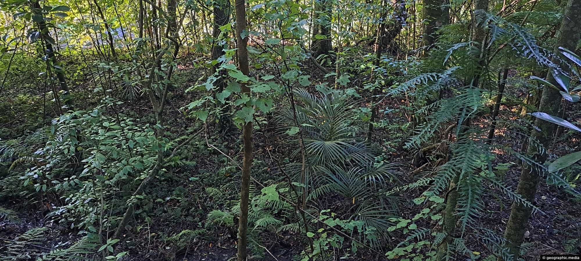 Typical young native plants growing on the forest floor in Ōrongorongo Forest Park, Wainuiomata. The ferns seen here are nīkau palms, the only palm species in the world that naturally grows outside of tropical regions.